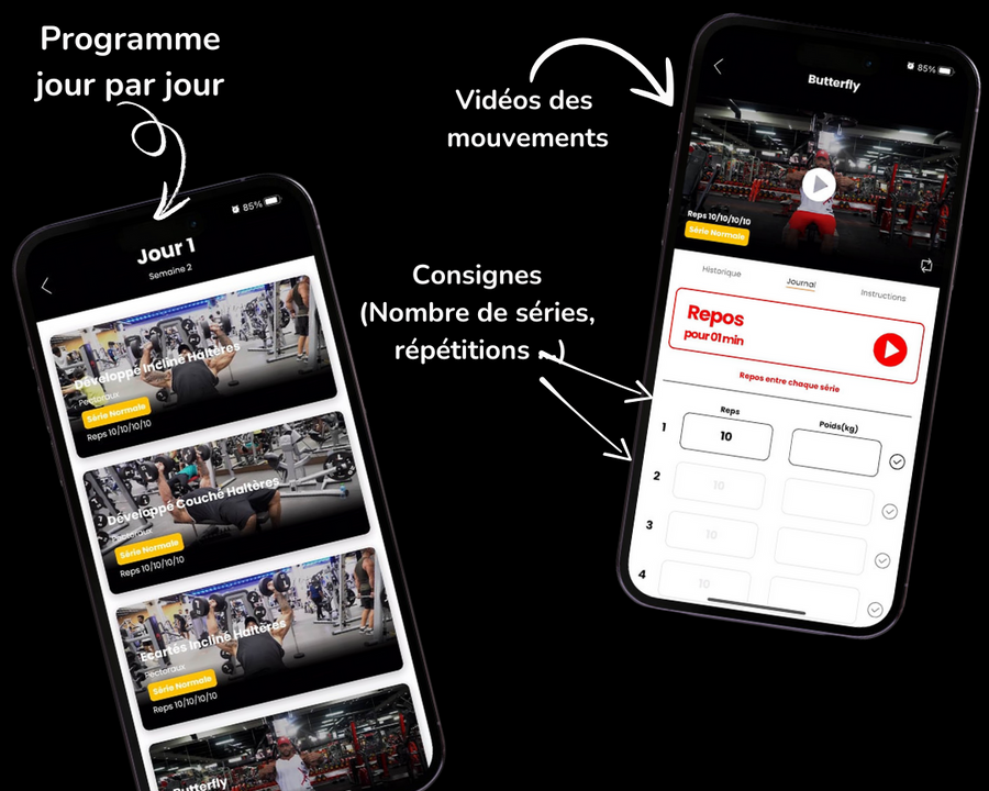 📈 Des détails précis sur l'intensité, la durée de chaque séance, les temps de pause, les explications des mouvements à réaliser.. etc
