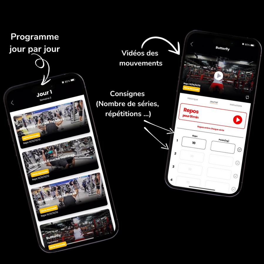 🏋️♂️ Suivez vos séances pas à pas : nombre de séries, répétitions, vidéos des mouvements et chrono intégrés dans l’appli.